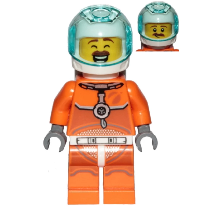Astronaut – Male, Orange Spacesuit with Dark Bluish Gray Lines, Trans Light Blue Large Visor, Large Smile with Eyes Closed and Smirk, Air Tanks