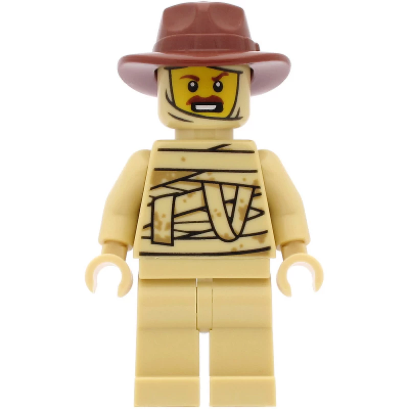 Minifigure, man, tan mummy costume, reddish brown fedora hat