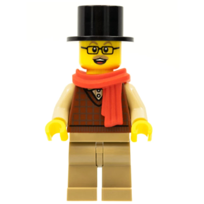 Minifigure, male with top hat and red scarf, Tom
